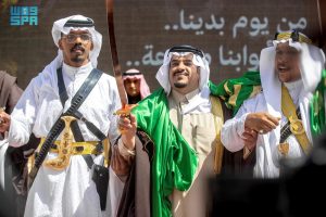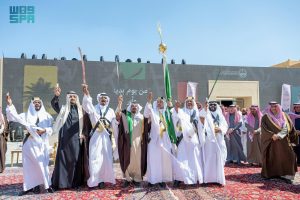 بعد ذلك قام الأمير محمد بن عبدالرحمن، في ختام جولته داخل المعرض بتأدية العرضة السعودية.