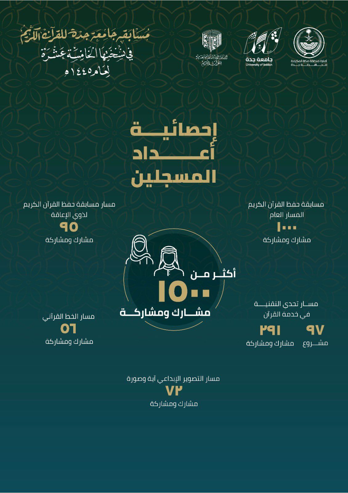 بلغ عدد المسجلين في مسابقة جامعة جدة للقرآن الكريم في دورتها الخامسة عشر للعام ١٤٤٥هـ لطلاب وطالبات التعليم الثانوي والجامعي بمحافظة جدة
