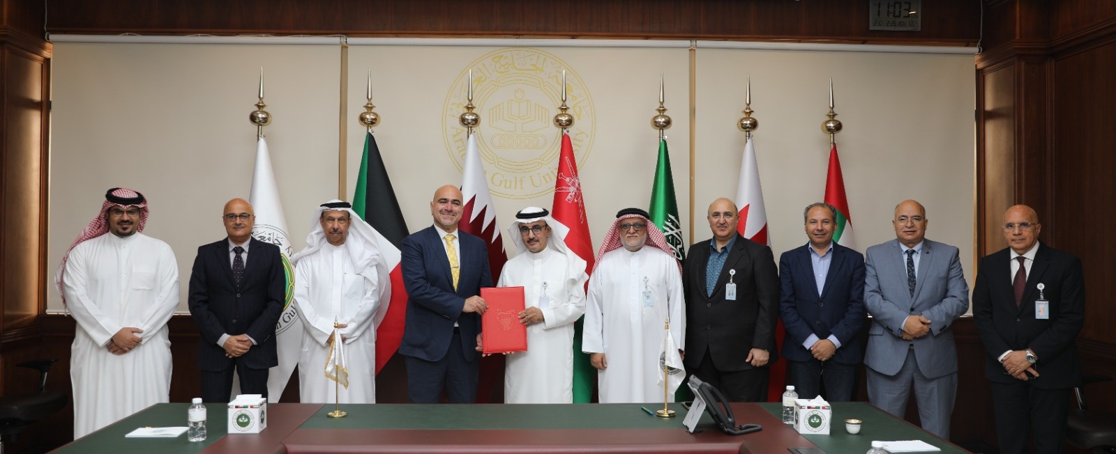 وقع معالي رئيس جامعة الخليج العربي الدكتور سعد بن سعود آل فهيد مذكرة تفاهم مع رئيس جامعة البحرين الدكتور فؤاد الأنصاري تهدف إلى تعزيز الجهود في النشر العلمي بجامعات دول مجلس التعاون الخليجي بطريقة إبداعية فاعلة وجاذبة، تُوصل رسائل الماجستير والدكتوراه الصادرة منها إلى الجامعات ومراكز البحث ومؤسسات ومعاهد الدراسات والبحوث والمؤسسات الفكرية أو بنوك الفكر على المستوى الخليجي والاقليمي والعالمي، بشكل يساهم في زيادة الأستشهادات بتلك الرسائل العلمية، ومعرفة عدد المتصفحين لملخصات الرسائل العلمية، و تحميل تلك الرسائل على منصة AGUsoft.