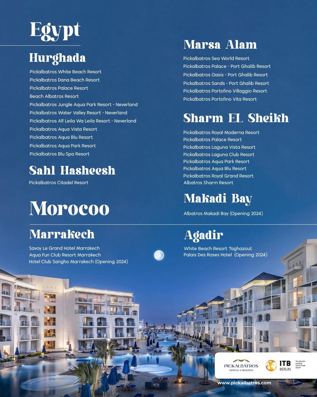 ويذكر أن مجموعة “بيك الباتروس للفنادق” تملك ٢٦ منتجعا بشرم الشيخ ومرسى علم والغردقة و ثلاث منتجعات بدولة المغرب وتحديدا فى منطقة مراكش واغادير وقريبا بنهاية هذا العام سيتم افتتاح منتجعين اخرين بدولة المغرب وقد حصدت بيك الباتروس جوائز هوليداى شيك HolidayCheck الألمانية لهذا العام لعدد ٧ منتجعات مابين شرم الشيخ ومرسى علم.