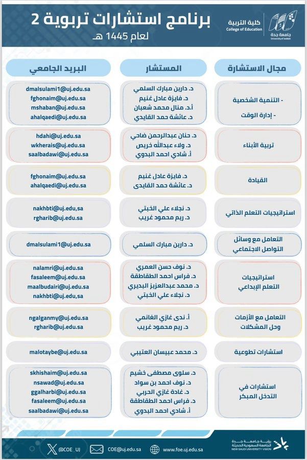 أطلقت جامعة جدة متمثلة في كلية التربية برنامج استشارات تربوية للموسم الثاني على التوالي ضمن برنامج “جامعة بلا أسوار” الذي يهدف إلى تعزيز دور الجامعة في رؤية المملكة 2030 في نقل المعرفة العلمية والأكاديمية للمجتمع وتحقيق السعادة المجتمعية.