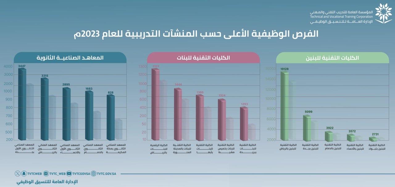 حقق المعهد الصناعي الثانوي بجدة المركز الاول في مؤشر توفير الفرص الوظيفية بما يقارب ٣٥٠٠ فرصة وظيفية للعام ٢٠٢٣ في مختلف تخصصات المعهد التدريبية.