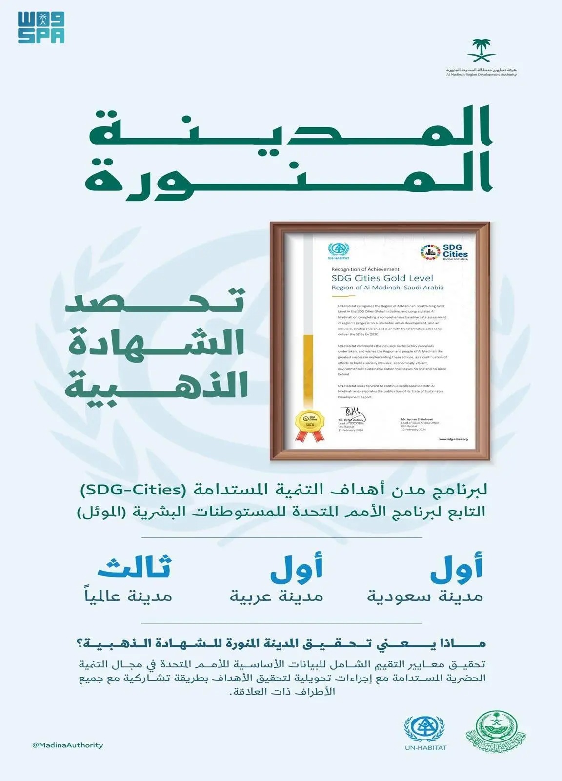المدينة المنورة تنال الشهادة الذهبية لبرنامج الأمم المتحدة SDG-Cities للتنمية المستدامة