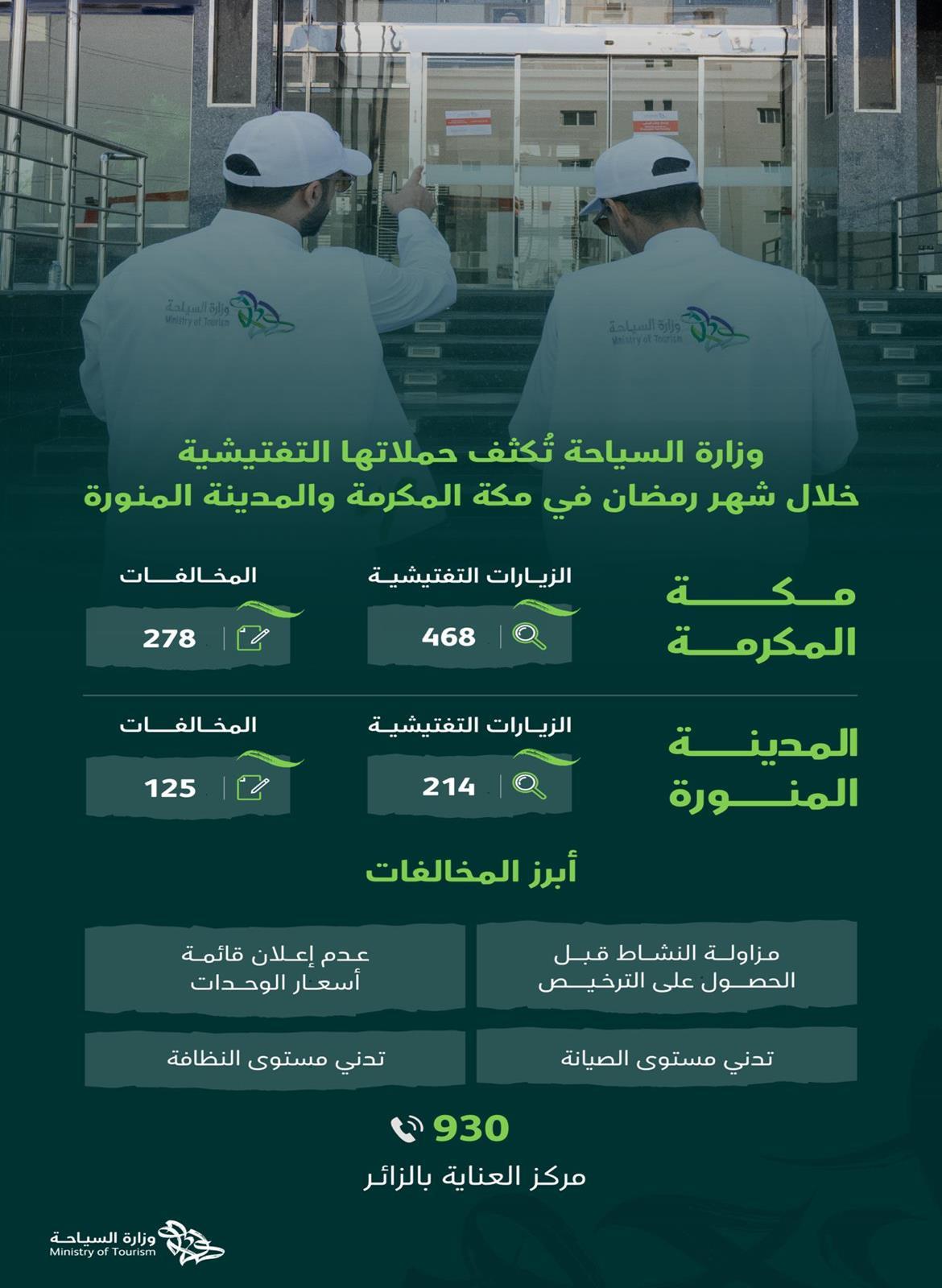 ونفّذت الفرق الرقابية للوزارة بالتزامن مع بداية موسم العمرة في شهر رمضان المبارك أكثر من 468 جولة رقابية وتفتيشية على مرافق الضيافة بالعاصمة المقدّسة، ورصدت أكثر من 278 مخالفة، كما نفّذت أكثر من 214 جولة رقابية وتفتيشية على مرافق الضيافة في المدينة المنورة، تم خلالها رصد أكثر من 125 مخالفة، وذلك في إطار حملتها لشهر رمضان المبارك.
