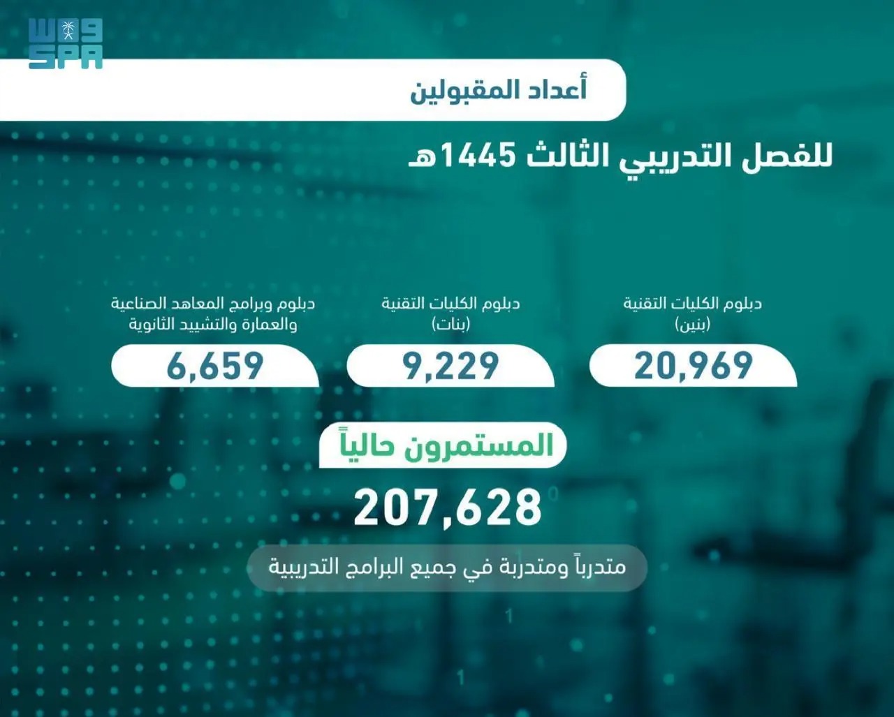 يذكر أن عدد المتدربين والمتدربات المستمرين في مختلف البرامج التدريبية المقدمة في المنشآت التدريبية يصل إلى حوالي 207 آلاف متدرب ومتدربة.