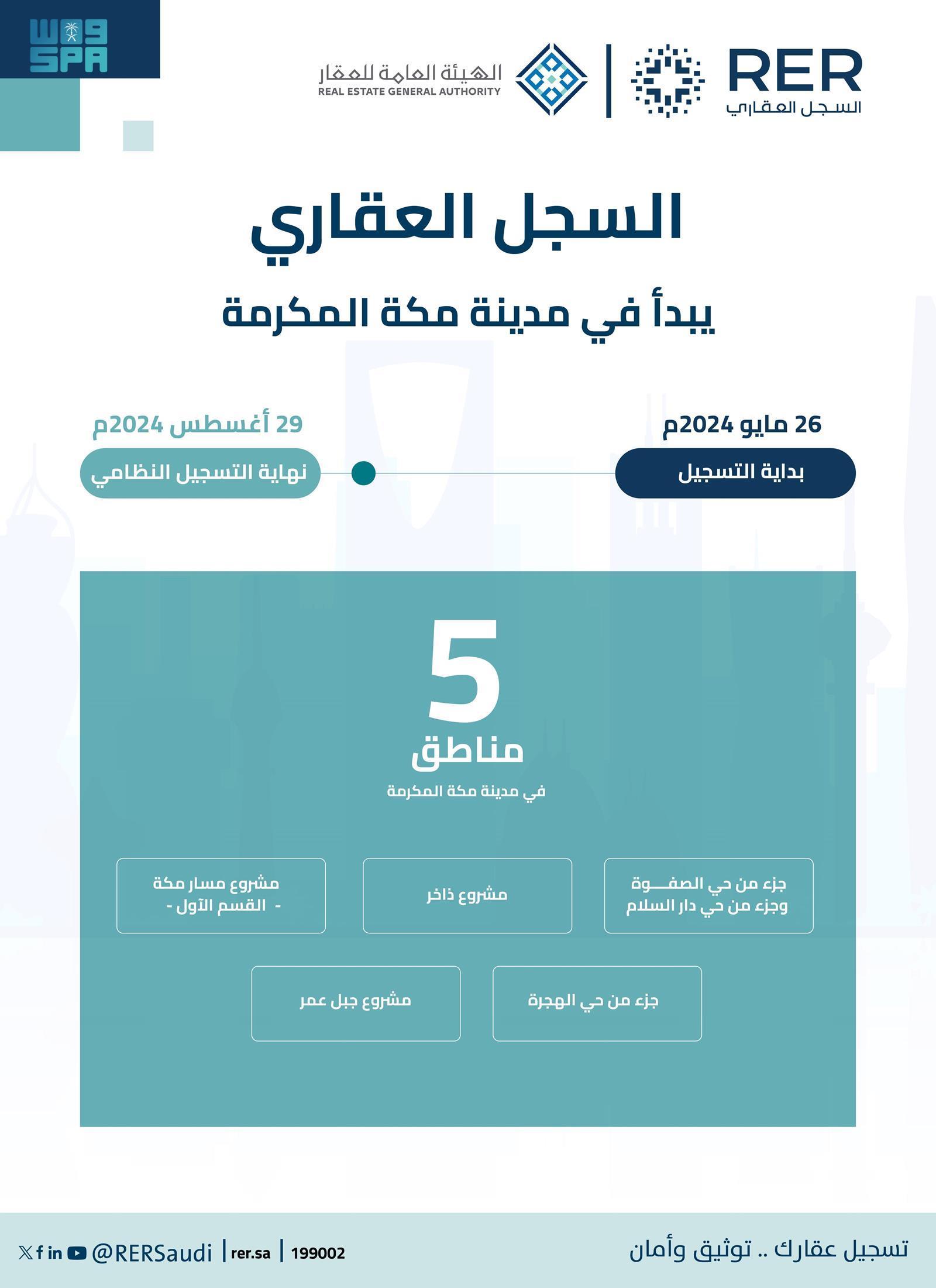 أعلنت الهيئة العامة للعقار عن 8 أحياء في مدينة “مكة المكرمة” ضمن المرحلة الخامسة من مراحل السجل العقاري، تضم 1336 قطعة عقارية، وذلك ابتداءً من 18 من ذي القعدة 1445هـ الموافق 26 مايو 2024م، ويستمر التسجيل حتى نهاية يوم 25 صفر 1446هـ الموافق 29 أغسطس 2024م.