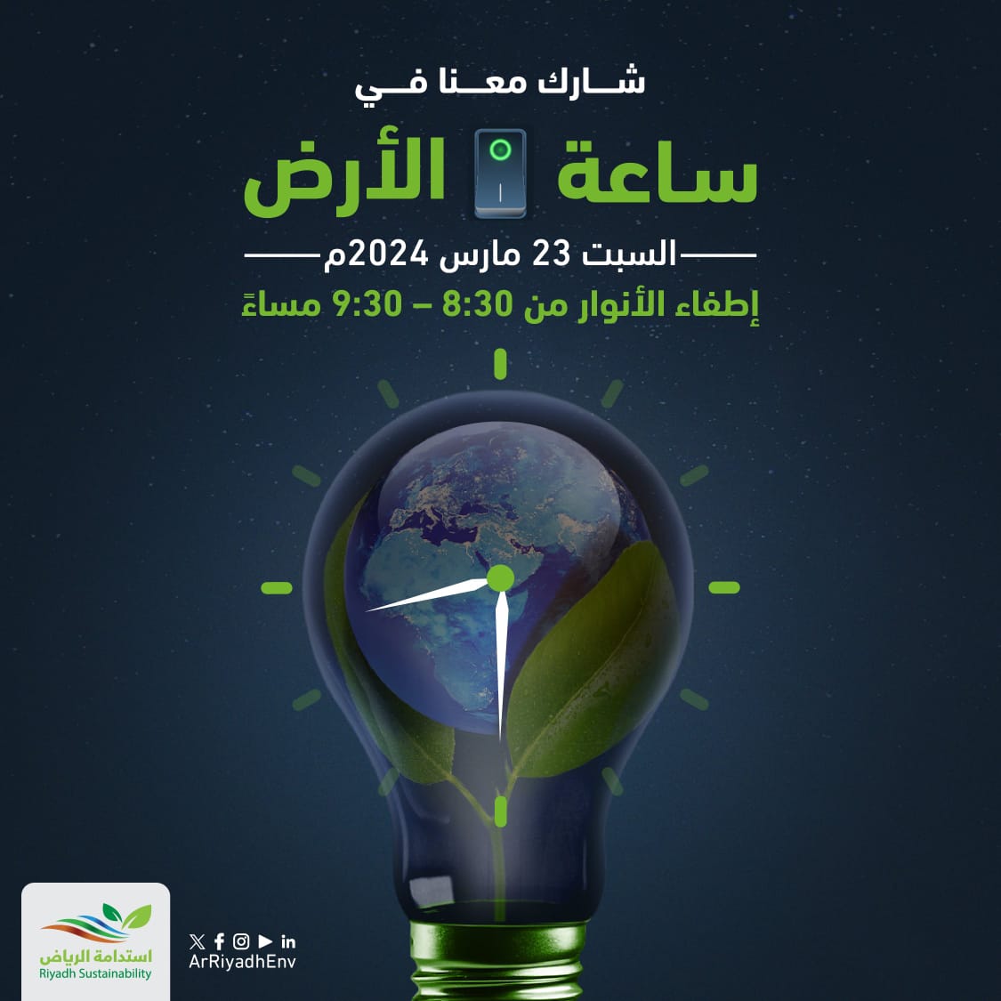 تشارك المملكة العربية السعودية دول العالم اليوم في ساعة الأرض الحدثٌ العالمي السَنوي الذي ينظمه الصندوق العالمي للطبيعة لتشجع الأفراد والمجتَمعات ومُلّاك المنازل والشَرِكات على إطفاء الأضواء والأجهزة الإلكترونية غير الضرورية لمدة ساعةٍ واحدة من الساعة 8:30 حتّى 9:30 حسب توقيت الدولة المحليّ اليوم السبت، وذلك لرفع الوعي بخطر التغير المناخي.