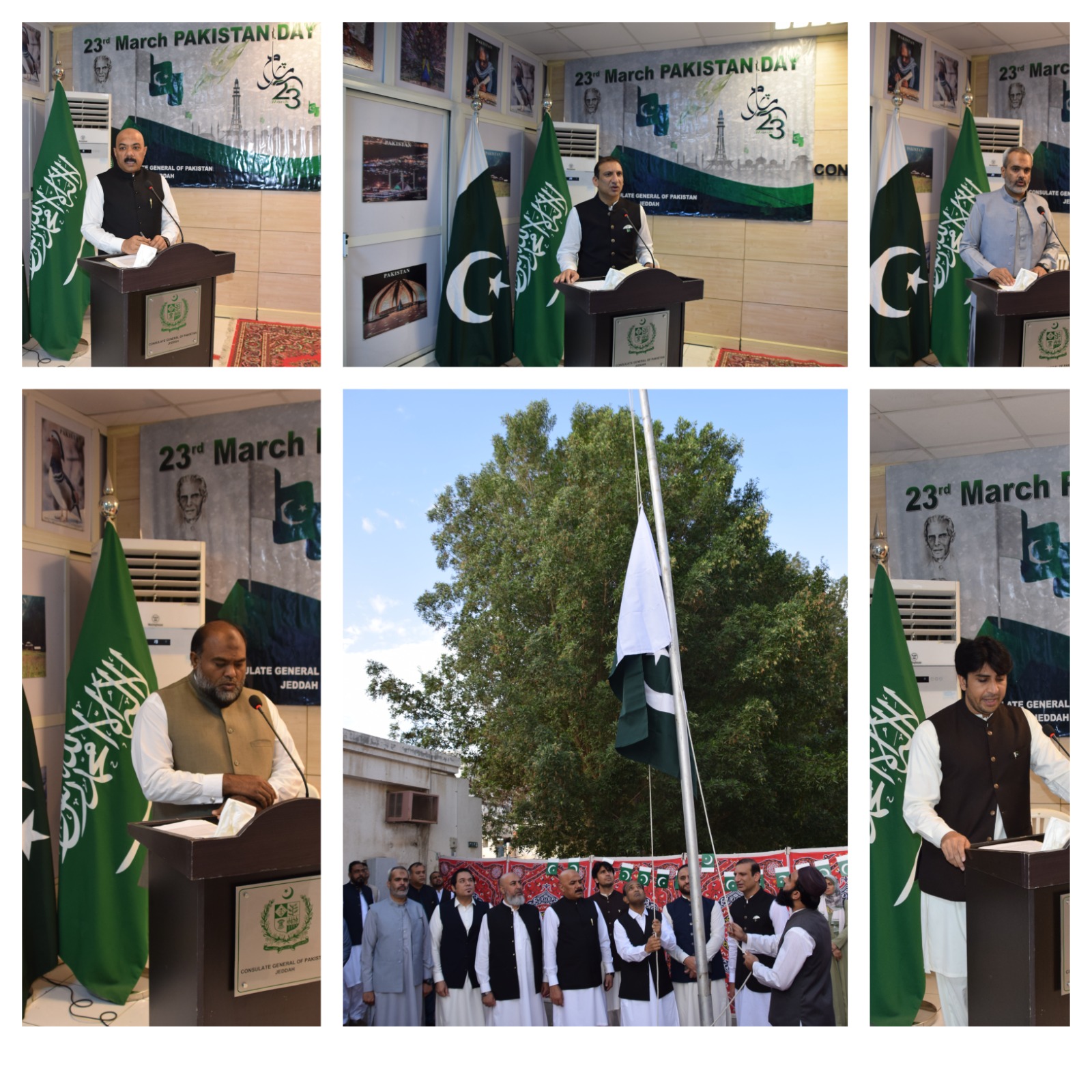 في صباح اليوم بمقر القنصلية العامة بجدة وسط عزف النشيد الوطني تم رفع العلم الوطني لدولة باكستان بحضورعدد كبير من أفراد الجالية وتمت قراءة رسائل خاصة بهذه المناسبة من قبل رئيس الدولة ورئيس الوزراء ووزير شؤون الخارجية الباكستاني احتفالا بهذا اليوم المهم.