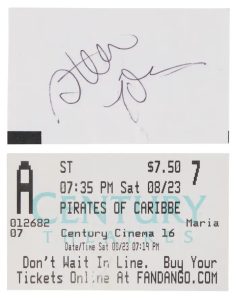 وحتى العناصر التي لا علاقة لها بشركة أبل، مثل تذكرة فيلم “قراصنة الكاريبي” التي تحمل توقيع جوبز بالكاد يمكن قراءتها، بيعت مقابل 14653 دولارا، تم أيضًا بيع ملصق فيلم “Toy Story” الذي يحمل توقيع جوبز بالمزاد العلني مقابل 25000 دولار كحد أدنى.