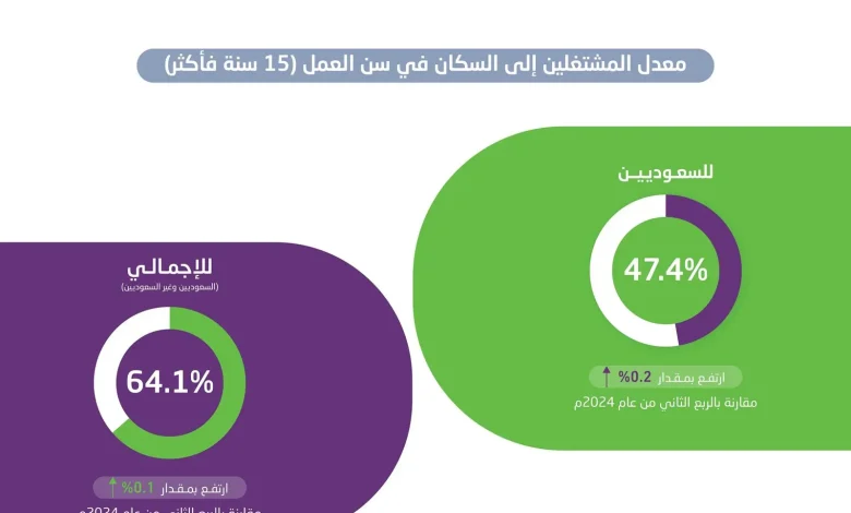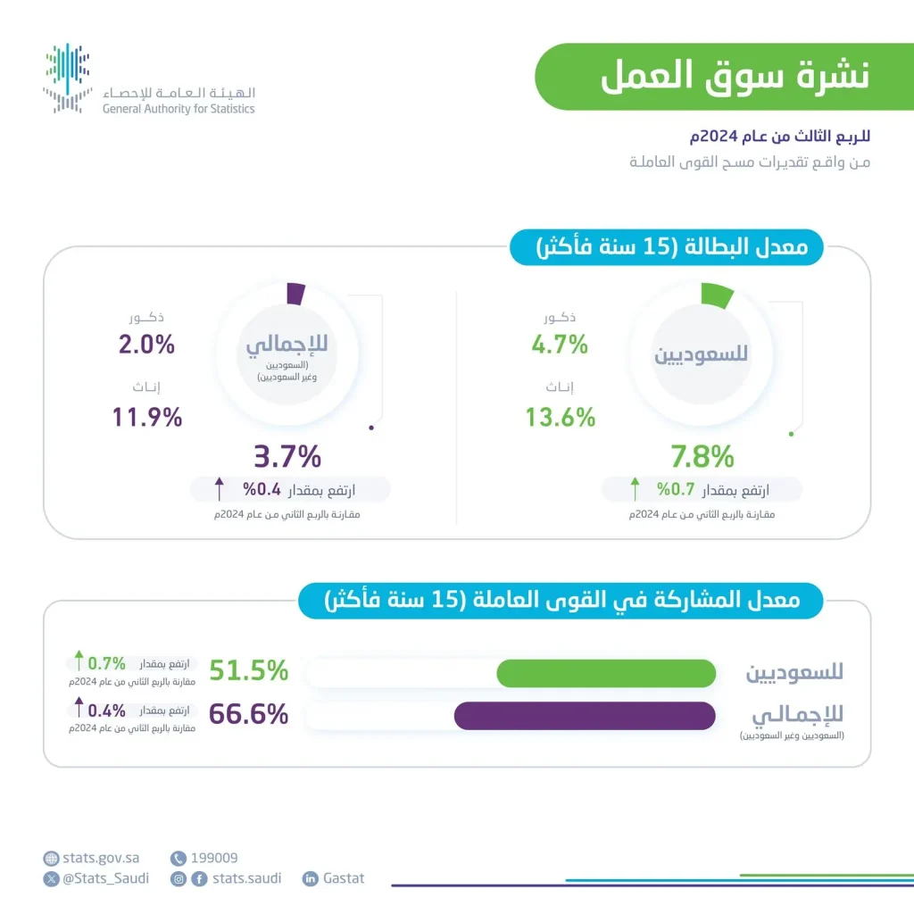 وأفادت نتائج النشرة أن معدل المشاركة في القوى العاملة (للسعوديين وغير السعوديين) 66.6% مسجلًا بذلك ارتفاعًا مقداره 0.4 نقطة مئوية مقارنة بالربع الثاني من عام 2024م، كما ارتفع معدل مشاركة السعوديين في القوى العاملة في الربع الثالث لعام 2024م بمقدار 0.7 نقطة مئوية حيث بلغ 51.5%، مسجلًا ارتفاعًا سنويًّا بمقدار 0.7 نقطة مئوية، بينما سجل معدل المشتغلين السعوديين إلى السكان ارتفاعًا بمقدار 0.2 نقطة مئوية حيث بلغ 47.4%، مسجلًا ارتفاعًا سنويًّا بمقدار 1.1 نقطة مئوية.