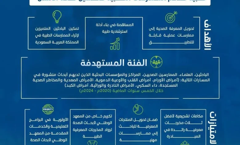 أطلق المعهد الوطني لأبحاث الصحة، مبادرة تحويل مخرجات أبحاث الصحة إلى معرفة طبية، وذلك عبر تفعيل نتائج الأبحاث الصحية المنشورة خلال الخمس سنوات الماضية، وتحويلها إلى أدلة استرشادية تدعم الممارسات الطبية من خلال تطبيق أدوات ترجمة المعرفة.