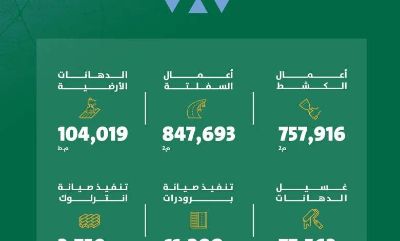 وشملت الأعمال تنفيذ 847.693 مترًا مربعًا من أعمال السفلتة، إلى جانب 757.916 مترًا مربعًا من أعمال الكشط، مما يعزز من جودة الطبقات الإسفلتية وامتثالها للمعايير الفنية، كما امتدت الأعمال إلى 77.562 مترًا مربعًا من غسل الدهانات، و104.019مترًا مربعًا من الدهانات الأرضية.