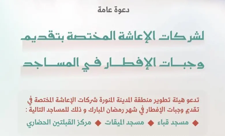 أعلنت هيئة تطوير المدينة المنورة بدء استقبال طلبات شركات الإعاشة لخدمة تقديم وجبات “إفطار صائم” خلال شهر رمضان المبارك في عددٍ من المساجد التاريخية، وتشمل: مسجد قباء، ومسجد الميقات، ومركز القبلتين الحضاري.
