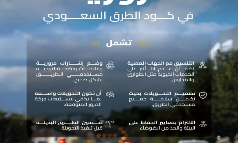 وبينت أن كود الطرق السعودي حدد مجموعة من الضوابط، تشمل التنسيق مع الجهات المعنية لضمان عدم التأثير على الخدمات الحيوية مثل الطوارئ والمدارس، بالإضافة إلى وضع إشارات مرورية وعلامات واضحة لتوجيه مستخدمي الطرق بشكل صحيح, كما يتضمن تصميم التحويلات بحيث تضمن سلامة مستخدمي الطرق وأن تكون واسعة بما يكفي لاستيعاب حركة المرور المتوقعة.