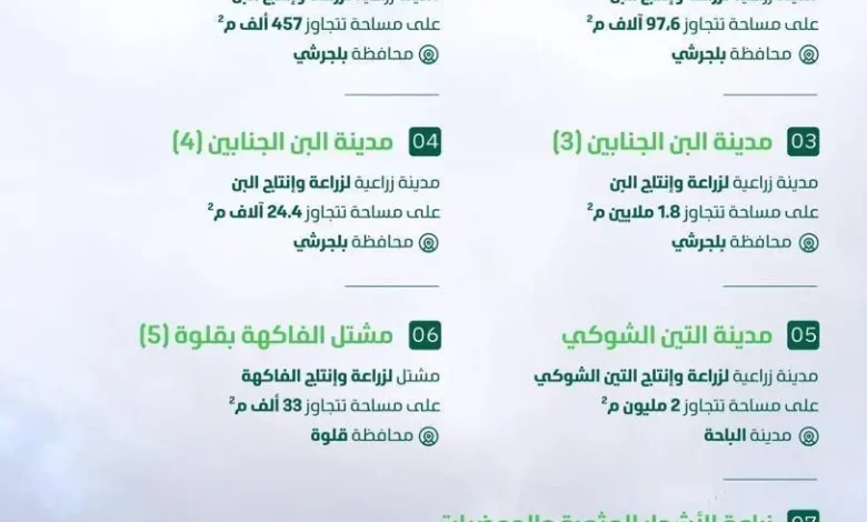 وشملت الفرص الاستثمارية، 4 مدن زراعية لزراعة وإنتاج البن بالجنابين، الأولى على مساحة تتجاوز 97.6م2, والثانية مساحتها 457م2, والثالثة على مساحة تتجاوز 1.8 مليون م2, والرابعة على مساحة تتجاوز 24.4م2 بمحافظة بلجرشي.