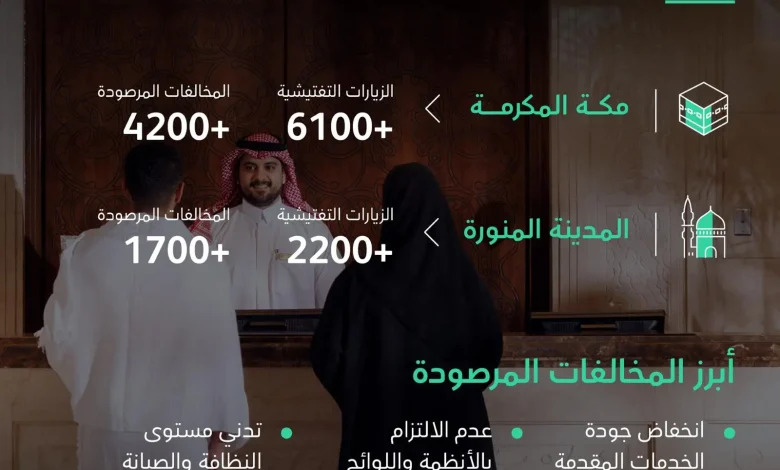 وقامت الفرق الرقابية للوزارة بمكة المكرمة بتنفيذ أكثر من 6100 زيارة رقابية على مرافق الضيافة والأنشطة السياحية في العاصمة المقدسة، جرى خلالها رصد أكثر من 4200 مخالفة، كما قامت الفرق الرقابية في المدينة المنورة بتنفيذ أكثر من 2200 زيارة رقابية على مرافق الضيافة والأنشطة السياحية بالمنطقة، وتم خلالها رصد أكثر من 1700 مخالفة.