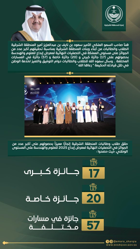 هنأ صاحب السمو الملكي الأمير سعود بن نايف بن عبدالعزيز أمير المنطقة الشرقية الطلاب والطالبات من أبناء وبنات المنطقة الشرقية بمناسبة تحقيقهم أكبر عدد من الجوائز على مستوى المملكة في التصفيات النهائية لمعرض إبداع للعلوم والهندسة بحصولهم على (17) جائزة كبرى و (20) جائزة خاصة و (57) جائزة في المسارات المختلفة .. وسأل سموه الله للطلاب والطالبات دوام التوفيق والتميز لخدمة الوطن في ظل قيادته الحكيمة ” رعاها الله “
