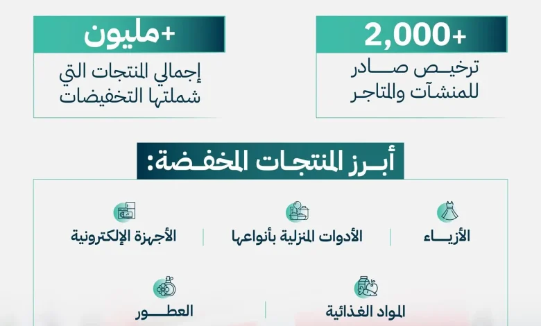 وبينت الوزارة أن عدد رخص التخفيضات للمنشآت التجارية والمتاجر الإلكترونية لموسم رمضان وعيد الفطر حتى الآن بلغت أكثر من ألفي رخصة، شملت أكثر من مليون منتج، أبرزها: الأزياء، والأدوات المنزلية بأنواعها، والأجهزة الإلكترونية والمواد الغذائية، والعطور وغيرها، وبإمكان المنشآت التجارية والمتاجر إصدار الرخص إلكترونيًا عبر: sales.mc.gov.sa .