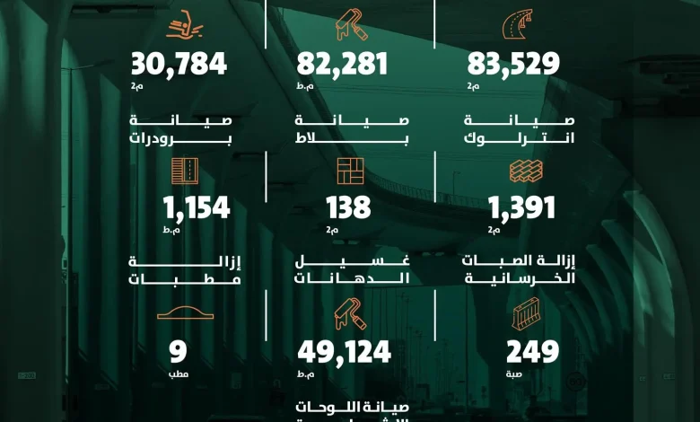 وشملت الأعمال تنفيذ 88529 مترًا مربعًا من أعمال السفلتة، 82281 مترًا مربعًا من الدهانات الأرضية، إلى جانب إصلاح 30784 مترًا مربعًا من المهابط والحفر، مما يعزز جودة الطرق ويضمن سلامة مستخدميها , إضافة إلى إزالة 1391 مترًا مربعًا من الصبات الخرسانية، وإزالة تسعة مطبات، وصيانة 249 مترًا مكعبًا من الإنترلوك، إضافةً إلى تنظيف وغسيل 49124 مترًا مربعًا من الدهانات، وصيانة 161 لوحة إرشادية لضمان وضوح العلامات المرورية.