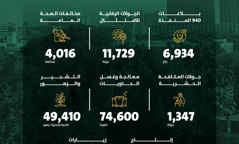 وشملت الجهود تنفيذ 11.729 جولة رقابية على المنشآت، ومعالجة وغسل 74.600 حاوية، إلى جانب زراعة 49.410 أشجار وشجيرات وزهور.