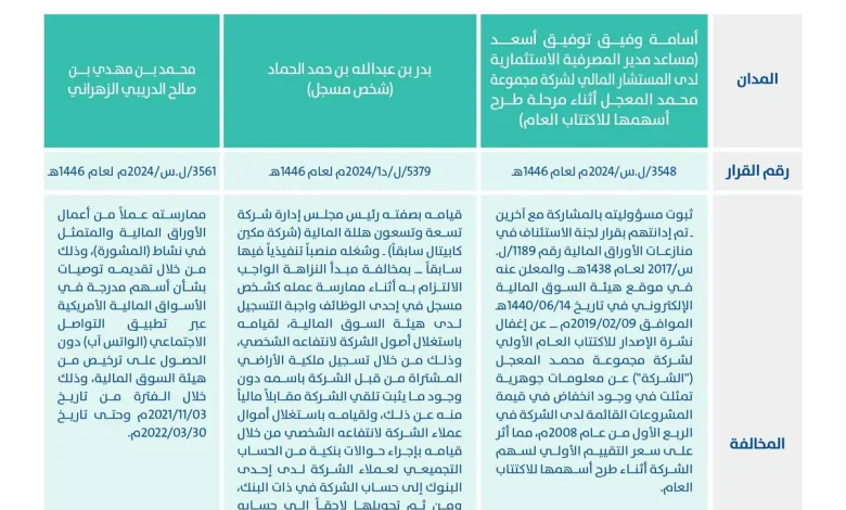 وأوضحت الهيئة أن لجنة الاستئناف أصدرت قرارها القطعي الأول بإدانة أسامة وفيق توفيق أسعد (مساعد مدير المصرفية الاستثمارية لدى المستشار المالي لشركة مجموعة محمد المعجل أثناء مرحلة طرح أسهمها للاكتتاب العام)، وذلك بعد ثبوت مسؤوليته بالمشاركة مع آخرين ــ تم إدانتهم بقرار لجنة الاستئناف في منازعات الأوراق المالية رقم 1189/ل. س/2017 لعام 1438هـ، والمعلن عنه في موقع هيئة السوق المالية الإلكتروني في تاريخ 1440/06/14هـ الموافق 2019/02/09م ــ عن إغفال نشرة الإصدار للاكتتاب العام الأولي لشركة مجموعة محمد المعجل “الشركة” عن معلومات جوهرية تمثلت في وجود انخفاض في قيمة المشروعات القائمة لدى الشركة في الربع الأول من عام 2008م، مما أثر في سعر التقييم الأولي لسهم الشركة أثناء طرح أسهمها للاكتتاب العام، حيث فرضت عليه غرامة مالية قدرها 100 ألف ريال، إلى جانب منعه من إدارة المحافظ أو العمل مستشار استثمار لمدة خمس سنوات، وكذلك منعه من العمل في الجهات الخاضعة لإشراف هيئة السوق المالية لمدة خمس سنوات أيضًا.
