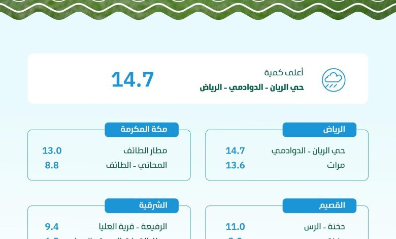 سجّلت منطقة الرياض أعلى معدلٍ لكميات هطول الأمطار بـ (14.7) ملم، في حي الريان بمحافظة الدوادمي، وذلك ضمن (7) مناطق بالمملكة شهدت هطول كميات متفرقة من الأمطار، فيما سجّلت مزارع خروب بشقراء في المنطقة (14.0) ملم، ومرات (13.6) ملم.