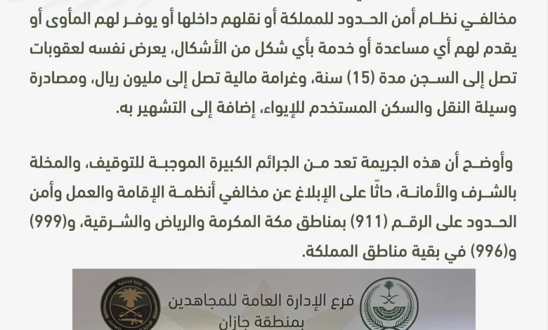 وأكد المتحدث الرسمي للإدارة العامة للمجاهدين، أن كل من يسهل دخول مخالفي نظام أمن الحدود للمملكة أو نقلهم داخلها أو يوفر لهم المأوى أو يقدم لهم أي مساعدة أو خدمة بأي شكل من الأشكال، يعرض نفسه لعقوبات تصل إلى السجن مدة (15) سنة، وغرامة مالية تصل إلى مليون ريال، ومصادرة وسيلة النقل والسكن المستخدم للإيواء، إضافة إلى التشهير به.