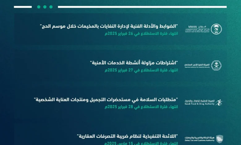 من جانبها تستطلع هيئة الزكاة والضريبة والجمارك الآراء بشأن مشروع (اللائحة التنفيذية لنظام ضريبة التصرفات العقارية)، وذلك لإيضاح كافة التعاريف ذات الصلة بضريبة التصرفات العقارية وتوضيح نطاق فرض الضريبة واستحقاقها وسدادها والإعفاءات منها مع تحديد معايير وضوابط لتلك الإعفاءات، بالإضافة إلى تحديد الأحكام المتصلة برد الضريبة المسددة بالزيادة أو بالخطأ، وحق الهيئة في إعادة تقييم احتساب الضريبة، وينتهي الاستطلاع على المشروع بتاريخ 15 مارس 2025م.