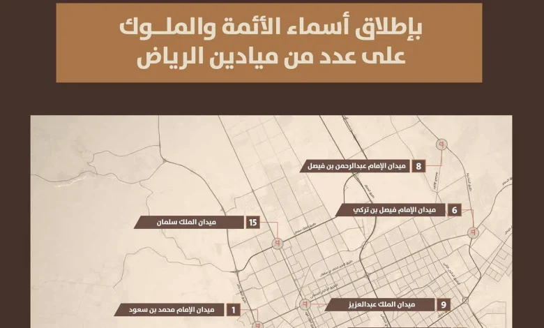 خادم الحرمين الشريفين يوجّه بناء على ما رفعه سمو ولي العهد بإطلاق أسماء الأئمة والملوك على عدد من ميادين الرياض
