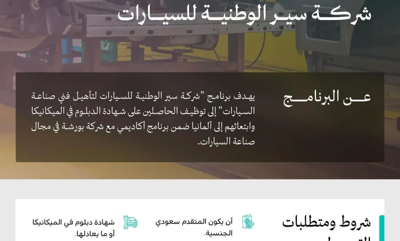أعلنت وزارة الصناعة والثروة المعدنية، بالتعاون مع برنامج خادم الحرمين الشريفين للابتعاث، عن بدء التقديم على برنامج شركة سير الوطنية للسيارات، لتأهيل فنيي صناعة السيارات التابع لبرامج “شركة سير لصناعة السيارات”، التي تُعد من برامج الابتعاث المبتدئ بالتوظيف ضمن مسار “واعد”، أحد مسارات إستراتيجية برنامج خادم الحرمين الشريفين للابتعاث، إحدى مبادرات برنامج تنمية القدرات البشرية، أحد برامج تحقيق “رؤية المملكة 2030″، التي أطلقها سمو ولي العهد رئيس مجلس الوزراء رئيس لجنة برنامج تنمية القدرات البشرية حفظه الله.