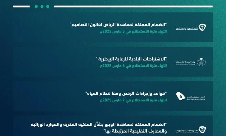 وتضمنت أبرز المشروعات المطروحة في المنصة مشروع “انضمام المملكة لمعاهدة الرياض لقانون التصاميم”؛ الذي تهدف منه الهيئة السعودية للملكية الفكرية إلى توضيح المعاهدة المقبلة، التي تهدف إلى تبسيط النظام العالمي لحماية التصاميم الصناعية، مما يسهّل على المصممين حماية أعمالهم في الأسواق المحلية وفي الخارج ويجعل تلك الحماية أسرع وأقلّ تكلفة بالنسبة لهم، وتتيح المنصة الاستطلاع على المشروع حتى 3 مارس 2025م.