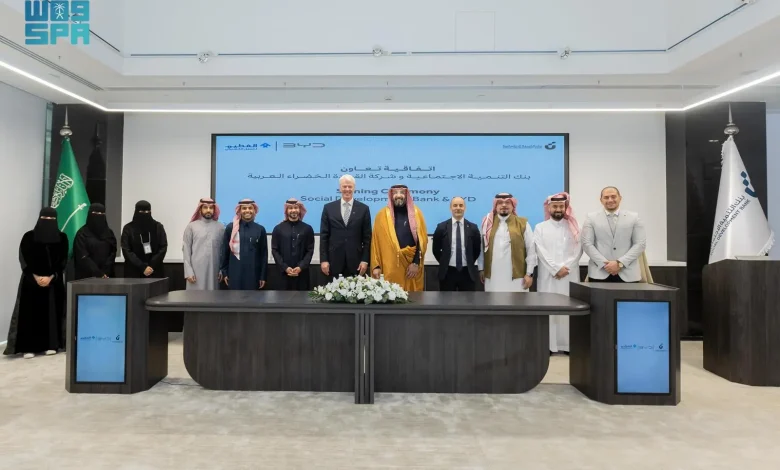 وقّع بنك التنمية الاجتماعية اتفاقية تعاون مع شركة القيادة الخضراء العربية للتجارة (BYD)، بهدف تمكين عملاء البنك، من امتلاك المركبات الكهربائية، بما يسهم في دعم البيئة الخضراء، وترشيد استهلاك الطاقة، وتمكين ممارسي العمل الحر في قطاع النقل التشاركي من استخدام وسائل نقل مستدامة.