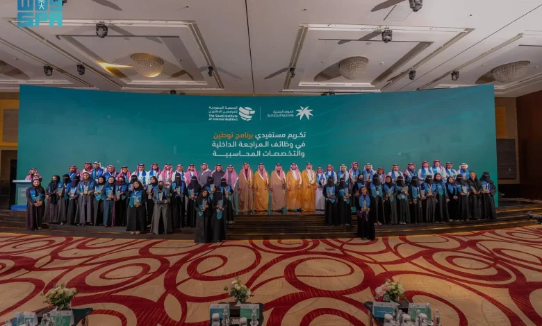 رعى معالي رئيس الديوان العام للمحاسبة رئيس مجلس إدارة الجمعية السعودية للمراجعين الداخليين الدكتور حسام بن عبدالمحسن العنقري اليوم، حفل تخرج وتكريم المتميزين في البرنامج التدريبي الذي قدمته الجمعية السعودية للمراجعين الداخليين لمستفيدي برنامج “توطين ” في وظائف المراجعة الداخلية والتخصصات المحاسبية، وذلك بحضور معالي نائب وزير الموارد البشرية والتنمية الاجتماعية لقطاع العمل الدكتور عبدالله بن ناصر أبوثنين.