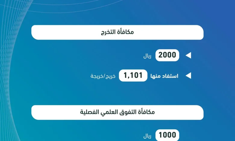 وأضاف أن عدد الحاصلين على مكافأة التفوق للخريجين للفصل ذاته بلغ (1101) خريجا وخريجة، حيث تمنح المكافأة لمن أتم التدريب بالمنشآت التدريبية، وحقق معدل تراكمي لا يقل عن (4.75) من (5.00) ، ويحصل المتدرب على مبلغ مالي مقداره ( 2000) ألفي ريال بالإضافة لشهادة تفوق.