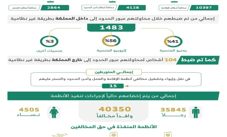 ثانيًا: بلغ إجمالي من تم ضبطهم خلال محاولتهم عبور الحدود إلى داخل المملكة (1483) شخصًا (41%) منهم يمنيو الجنسية، و(56%) إثيوبيو الجنسية، و(03%) جنسيات أخرى، كما تم ضبط (104) أشخاص لمحاولتهم عبور الحدود إلى خارج المملكة بطريقة غير نظامية.
