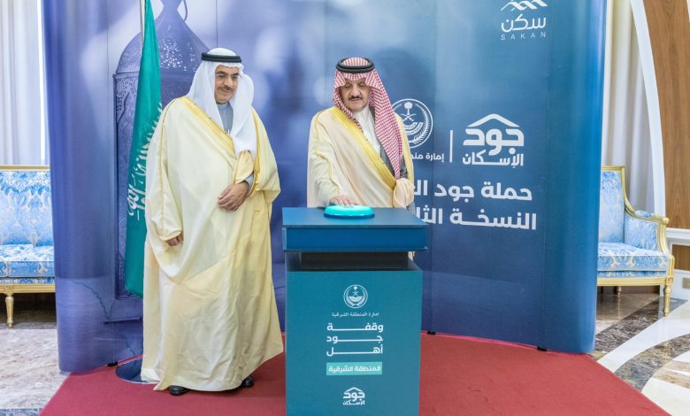 دشّن صاحب السمو الملكي الأمير سعود بن نايف بن عبدالعزيز، أمير المنطقة الشرقية، مشاركة المنطقة الشرقية في حملة “جود المناطق 2” التي أطلقتها منصة “جود الإسكان”، إحدى مبادرات مؤسسة الإسكان التنموي الأهلية “سكن”، وذلك تحت شعار “وقفة جود الشرقية”. وتهدف الحملة إلى تعزيز الوعي الاجتماعي والمشاركة المجتمعية في دعم الأسر المستحقة من خلال المنصة طيلة شهر رمضان المبارك لعام 1446هـ.