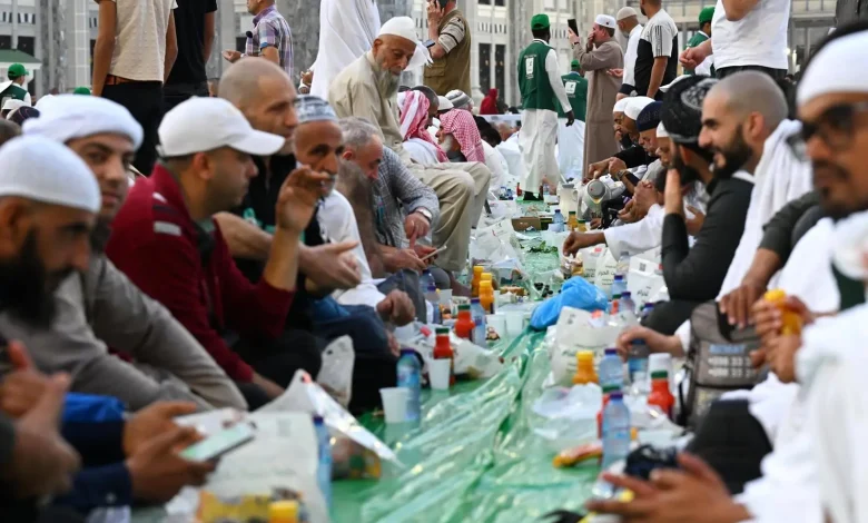 جموع الصائمين يصطفون لتناول موائد الإفطار بالمسجد الحرام مع ثاني أيام شهر رمضان المبارك