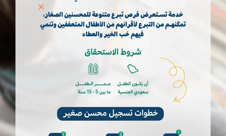 وتهدف هذه الخدمة إلى إشراك الأطفال في الفرص الخيرية والتنموية من خلال صفحة مخصصة داخل منصة إحسان تتيح لهم تقديم التبرعات بطرق مبسطة تحت إشراف أولياء أمورهم، مما يمكن الأسر من تعزيز روح البذل والعطاء، ويسهم في بناء جيل مدرك لأهمية الإسهام في تحسين حياة الآخرين.