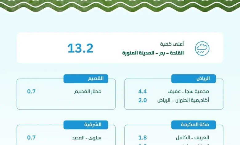 سجّلت منطقة المدينة المنورة أعلى معدلٍ لكميات هطول الأمطار بـ (13.2) ملم، في القاحة بمحافظة بدر، وذلك ضمن (6) مناطق بالمملكة شهدت هطول كميات متفرقة من الأمطار، فيما سجّلت أم البرك بوادي الفرع (4.0) ملم، ومطار العلا (2.5) ملم، والمندسة بالمدينة (2.2) ملم، وسد العيص بالعيص (0.6) ملم.