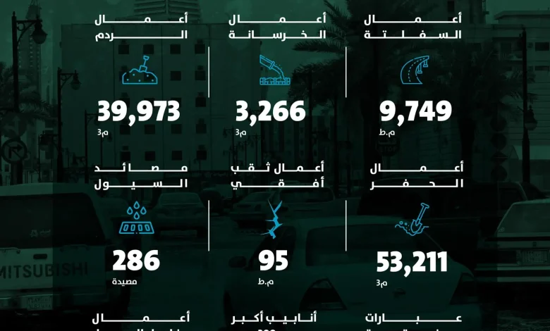 وشملت الأعمال تنفيذ 39.973 مترًا مكعبًا من أعمال الردم، و 3.266 مترًا مكعبًا من أعمال الخرسانة، إضافة إلى 9.749 مترًا مربعًا من أعمال السفلتة، وإنجاز 53.211 مترًا مكعبًا من أعمال الحفر لتعزيز أداء الشبكات.