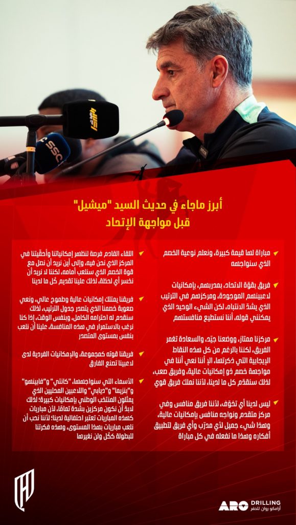واختتم:” فريقنا يمتلك إمكانيات عالية وطموح عالي ونعي صعوبة خصمنا الذي يتصدر جدول الترتيب لذلك سنقدم لهم احترامهم الكامل، وبنفس الوقت إذا كنا نرغب بالاستمرار في هذه المنافسة علينا أن نلعب بنفس مستوي المتصدر. فريقنا قوته كمجموعة والإمكانيات الفردية لدي لاعبينا تصنع الفارق”.