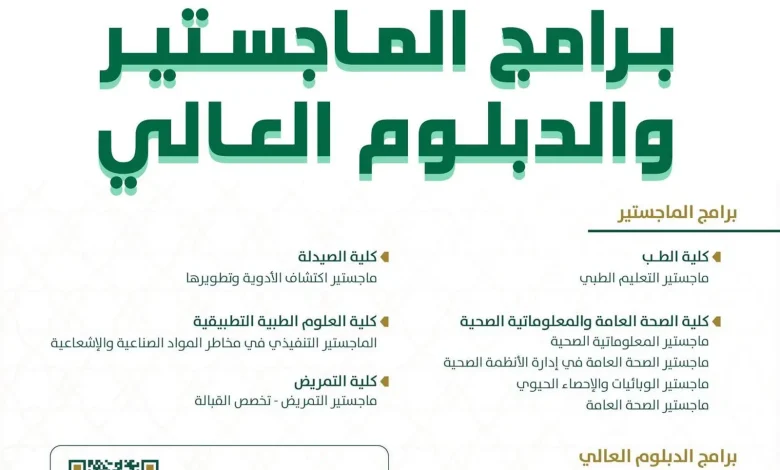 أعلنت جامعة الملك سعود بن عبدالعزيز للعلوم الصحية، عن بدء التقديم لبرامج الماجستير والدبلوم العالي في عدة تخصصات طبية وصحية، وذلك ضمن جهودها لتطوير الكفاءات المهنية في القطاع الصحي.