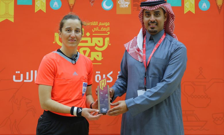 وكرم فهد الصيعري المدير التنفيذي للتسويق والاتصال المؤسسي في نادي القادسية المشرف العام على البطولة الحكمة الإيطالية شيرا بيرونا التي شاركت في المباراة الافتتاحية بجانب الحكمة السعودية ريم البيشي.