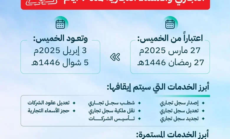 أعلنت وزارة التجارة عن إيقاف الخدمات ذات الصلة المباشرة بنظامي السجل والأسماء التجارية لمدة 7 أيام، اعتبارًا من 27 مارس، حتى 3 أبريل 2025م.