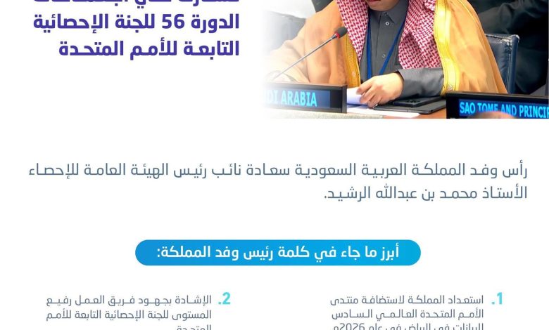 وتأتي هذه المشاركة في إطار تلبية لدعوة الأمم المتحدة المملكة للمشاركة في هذه الاجتماعات، والتعريف بأبرز استعداداتها لاستضافة منتدى الأمم المتحدة العالمي السادس للبيانات المزمع عقده في الرياض من 9 إلى 12 نوفمبر 2026م، والتشاور داخليًا ودوليًا حول مواءمة موعد المنتدى مع الأحداث الأخرى في التقويم الإحصائي والدولي.