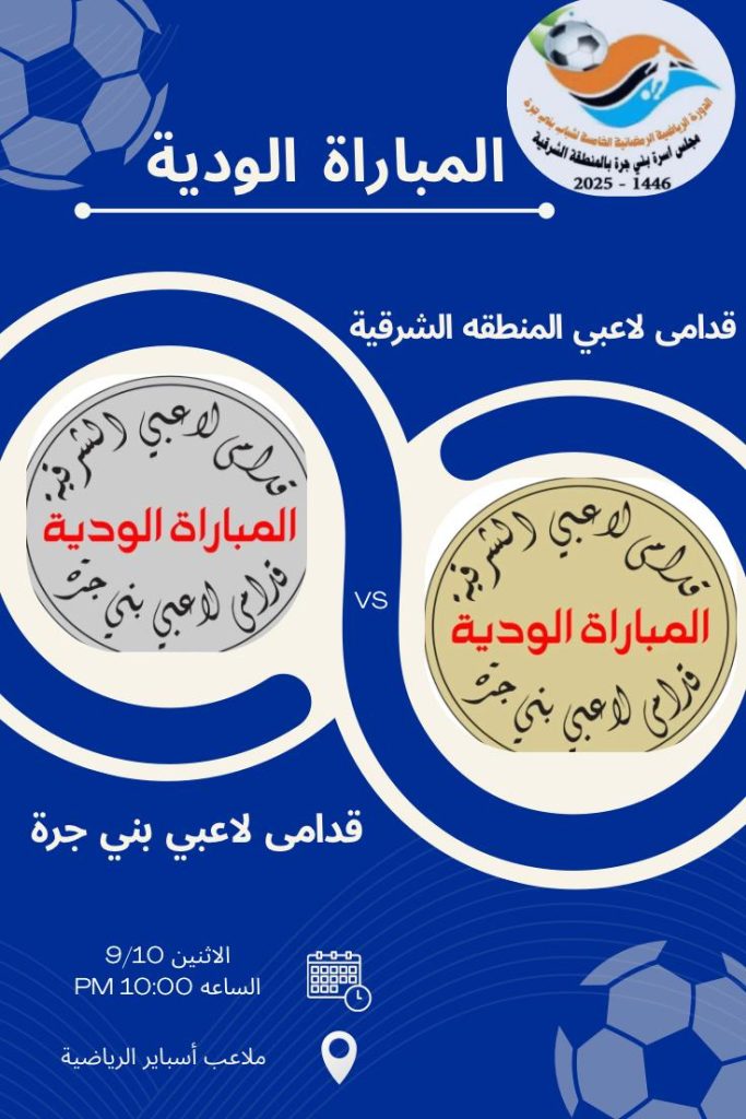 في إطار فعاليات الدورة الرياضية الخامسة لأسرة بني جرة في المنطقة الشرقية، تُقام مساء بعد غدٍ الاثنين مباراة ودية مرتقبة تجمع بين نخبة من نجوم اللاعبين القدامى في المنطقة الشرقية وفريق قدامى بني جرة، وذلك في تمام الساعة العاشرة مساءً.