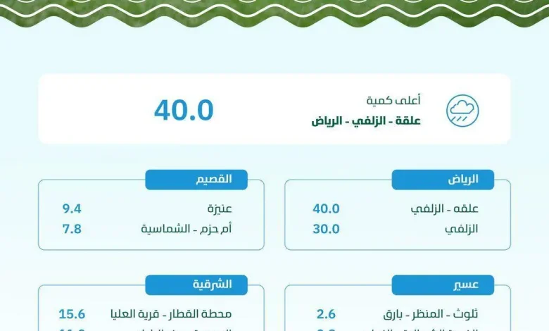 سجّلت محطة رصد علقة الزلفي بمنطقة الرياض أعلى معدل لكميات هطول الأمطار في المملكة بـ (40.0) ملم، وسجّلت محطة الزلفي (30.0) ملم، والبطين الجنوبي بالزلفي (11.0) ملم، ضمن (10) مناطق شهدت كميات متفرقة من الأمطار على مناطق المملكة خلال 24 ساعة الماضية.