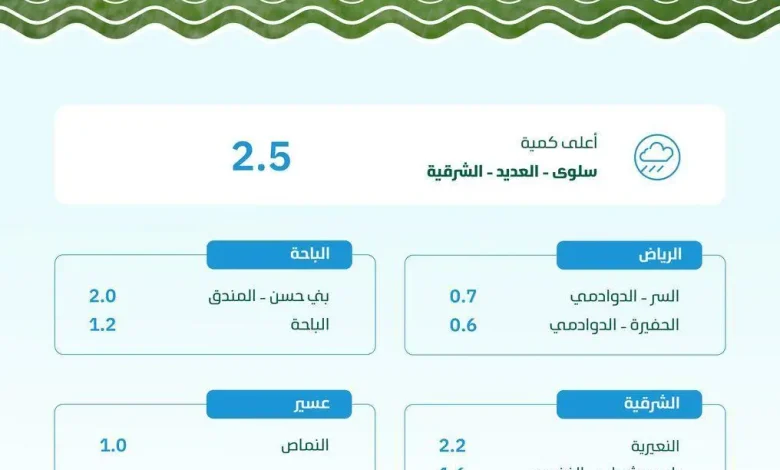 سجّلت المنطقة الشرقية أعلى معدل لكميات هطول الأمطار في المملكة بـ (2.5) ملم في منفذ سلوى بمحافظة العديد، وذلك ضمن (6) مناطق شهدت كميات متفرقة من الأمطار، فيما سجّلت النعيرية (2.2) ملم، وراس مشعاب بالخفجي (1.6) ملم، وحرس حدود منيفة بالجبيل (1.4) ملم.