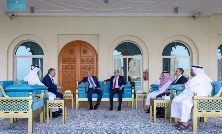 قام صاحب السمو الأمير فيصل بن فرحان بن عبدالله وزير الخارجية، اليوم ، بزيارة لدولة قطر، شارك خلالها في اجتماع ضم كلاً من معالي رئيس مجلس الوزراء وزير خارجية دولة قطر الشيخ محمد بن عبدالرحمن بن جاسم آل ثاني، ومعالي نائب رئيس الوزراء وزير الخارجية وشؤون المغتربين بالمملكة الأردنية الهاشمية الدكتور أيمن الصفدي، ومعالي وزير الخارجية والهجرة وشؤون المصريين بالخارج بجمهورية مصر العربية الدكتور بدر عبدالعاطي، ومعالي وزير الدولة بوزارة الخارجية في دولة الإمارات العربية المتحدة السيد خليفة شاهين المرر، وأمين سر اللجنة التنفيذية لمنظمة التحرير الفلسطينية السيد حسين الشيخ، ومبعوث الرئيس الأمريكي إلى الشرق الأوسط السيد ستيف ويتكوف.