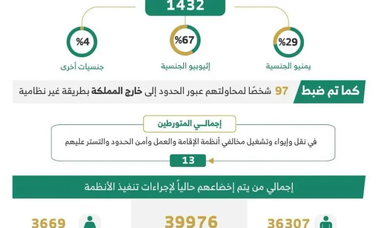 ثانيًا: بلغ إجمالي من تم ضبطهم خلال محاولتهم عبور الحدود إلى داخل المملكة (1432) شخصًا (29%) منهم يمنيو الجنسية، و(67%) إثيوبيو الجنسية، و(04%) جنسيات أخرى، كما تم ضبط (97) شخصًا لمحاولتهم عبور الحدود إلى خارج المملكة بطريقة غير نظامية.